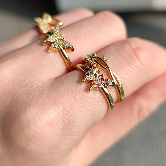 Eleganter verstellbarer Schmetterlingsring mit funkelnden Zirkonia, hochwertig vergoldet in 18 Karat