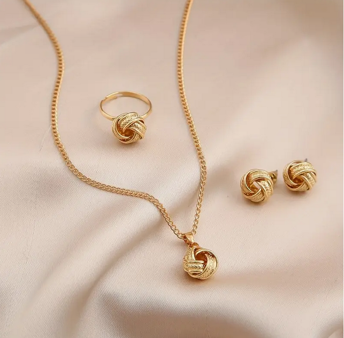 Vintage Boho Knoten Schmuckset – Ring, Ohrringe, Halskette